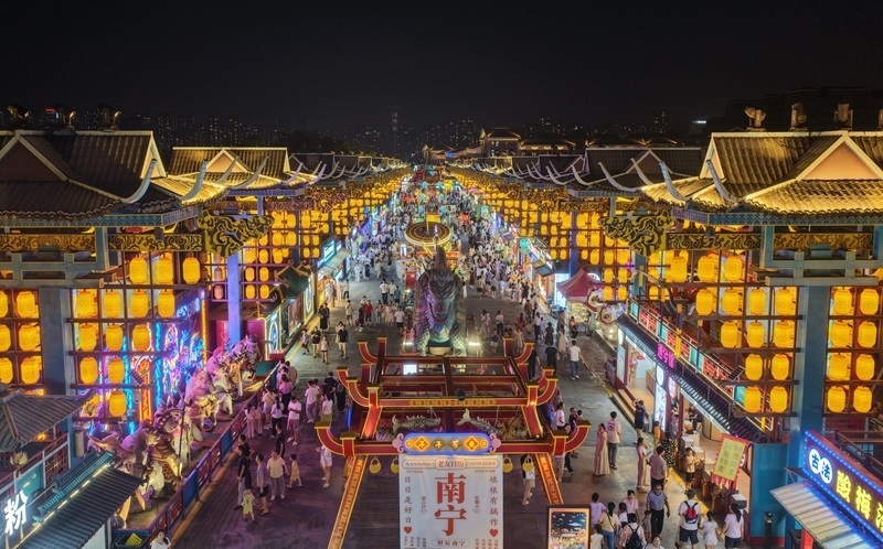 8月9日,在廣西南寧市“南寧之夜”街區(qū),游客逛夜市(無(wú)人機(jī)照片)。
