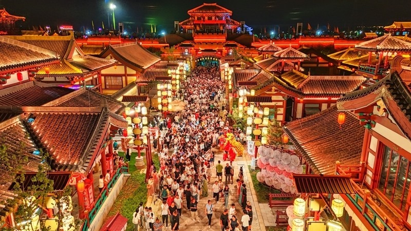 8月9日,山東樂陵影視城景區(qū)流光溢彩、游人如織(無(wú)人機(jī)照片)。