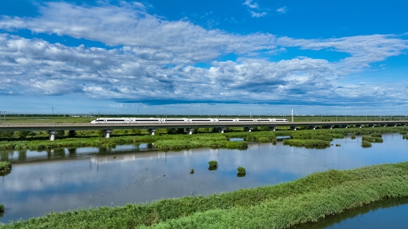 8月17日,復興號動車組列車行駛在哈齊高鐵線上(無人機照片)。