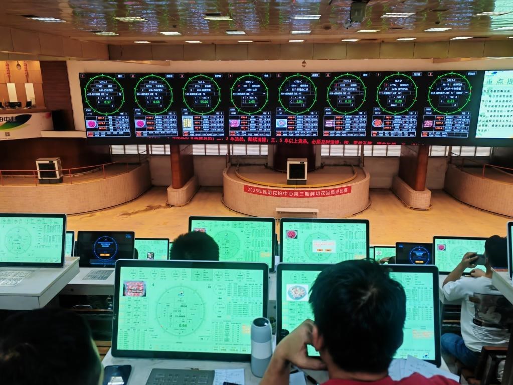 記者在昆明國(guó)際花卉拍賣交易中心看到,拍賣大鐘界面顯示著各種花卉的信息,數(shù)百名購(gòu)買商操作著競(jìng)價(jià)器選購(gòu)鮮花。昆明國(guó)際花卉拍賣交易中心副總經(jīng)理汪洋介紹,這里每天的鮮花交易量都超700萬(wàn)枝,單日最高交易量超1100萬(wàn)枝,30%以上的鮮花被各大電商和直播團(tuán)隊(duì)拍下,他們?cè)倌玫诫娚唐脚_(tái)或直播間銷售。