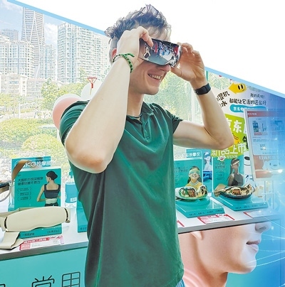 在深圳福田區(qū)華強(qiáng)北群星廣場(chǎng)購(gòu)物中心,來(lái)自德國(guó)的小伙子凱試戴電子眼部按摩儀。
