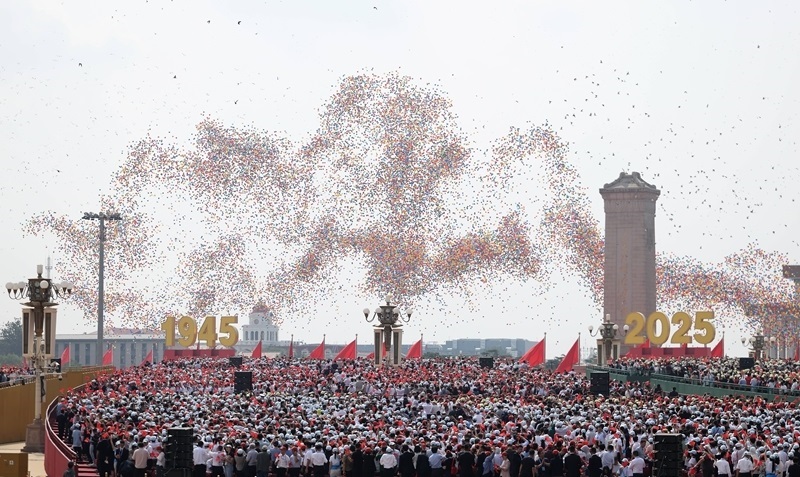 9月3日,紀念中國人民抗日戰(zhàn)爭暨世界反法西斯戰(zhàn)爭勝利80周年大會在北京隆重舉行。這是紀念大會現(xiàn)場放飛氣球。