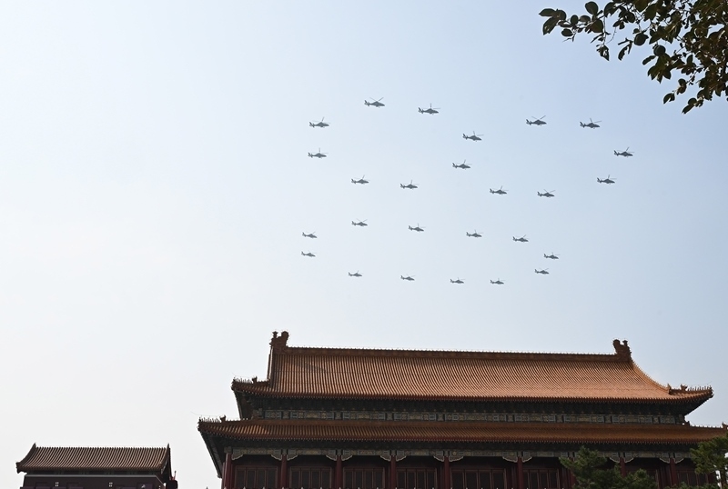 9月3日,紀念中國人民抗日戰(zhàn)爭暨世界反法西斯戰(zhàn)爭勝利80周年大會在北京隆重舉行。這是空中護旗梯隊接受檢閱。