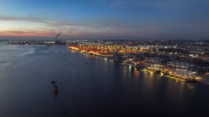 9月4日,海輪??繗J州港集裝箱自動(dòng)化碼頭裝卸集裝箱(無人機(jī)照片)。