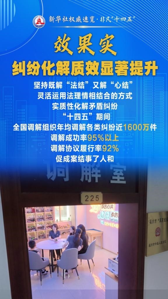 “十四五”期間,司法部堅持和發(fā)展新時代“楓橋經(jīng)驗”,充分發(fā)揮調(diào)解職能作用,以“機(jī)制全、領(lǐng)域廣、隊伍強(qiáng)、效果實”十二字為工作“秘訣”,大力加強(qiáng)矛盾糾紛排查化解,切實保障群眾合法權(quán)益,維護(hù)社會和諧穩(wěn)定。