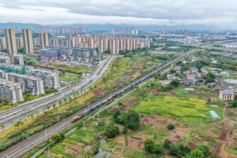 9月8日,滿載“重慶造”汽車的中歐班列(成渝)在重慶團(tuán)結(jié)村中心站順利發(fā)車(無(wú)人機(jī)照片)。