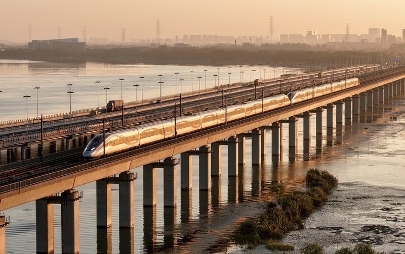 10月10日,在江蘇省昆山市,動車組列車通過京滬高鐵丹昆特大橋陽澄湖段(無人機(jī)照片)。