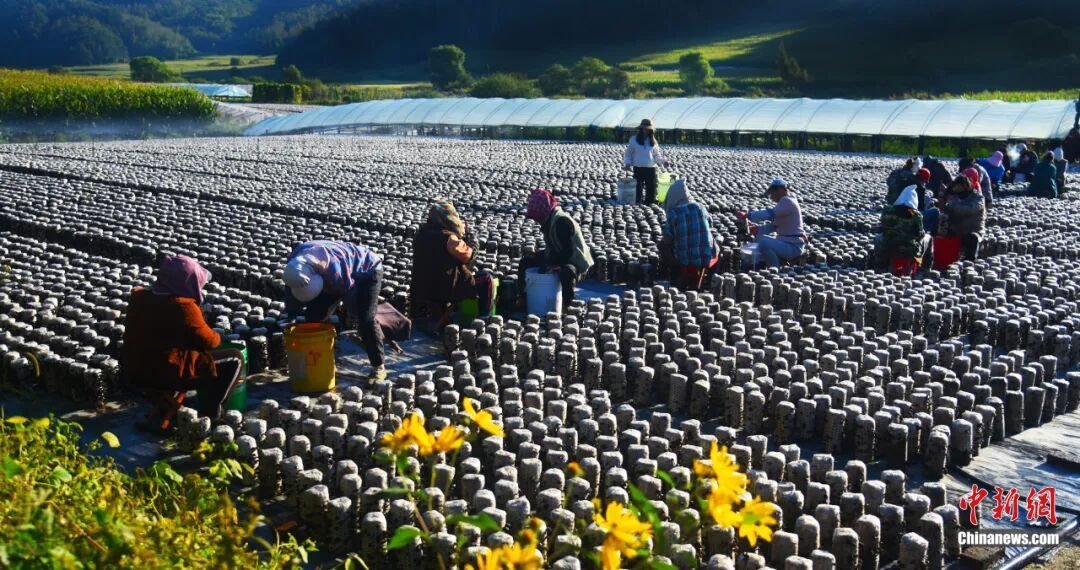 (菌農(nóng)們有序采摘。黃松甸鎮(zhèn)供圖)