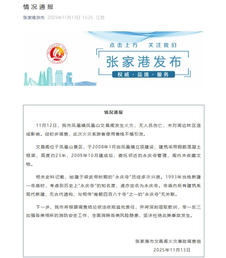 中新網(wǎng)11月13日電 據(jù)“張家港發(fā)布”微信公眾號(hào)消息,張家港市文昌閣火災(zāi)事故調(diào)查組13日發(fā)布情況通報(bào)。通報(bào)指出,11月12日,張家港市鳳凰鎮(zhèn)鳳凰山文昌閣發(fā)生火災(zāi),無(wú)人員傷亡,未對(duì)周邊林區(qū)造成影響。經(jīng)初步調(diào)查,此次火災(zāi)系游客使用香燭不慎引發(fā)。