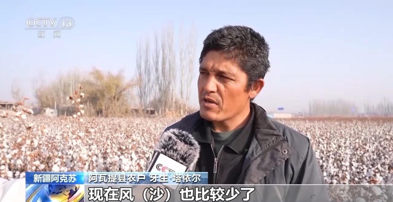 阿瓦提縣農(nóng)戶 牙生·塔依爾:種樹之后天氣變得很好,現(xiàn)在風(fēng)沙也比較少了,棉花白白的,以前棉花上黃黃的,土太多了,以前一畝地200到250公斤,現(xiàn)在350公斤。