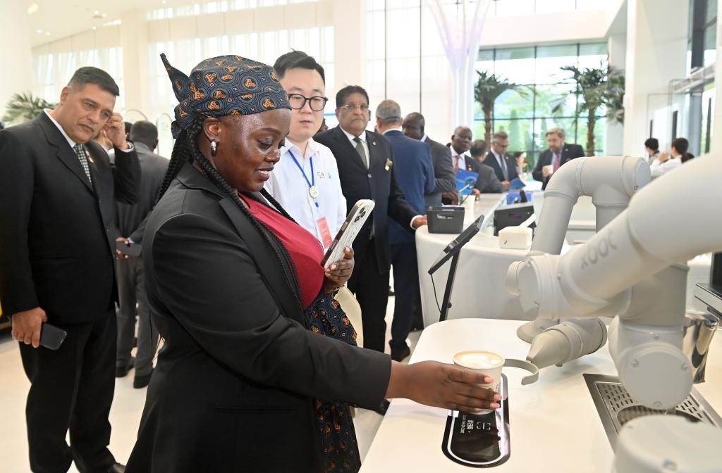 10月29日,駐華使節(jié)代表團在中國-東盟國家人工智能應用合作中心參觀體驗機器人制作咖啡。新華社記者 陸波岸 攝