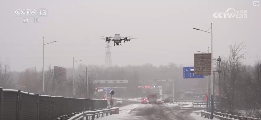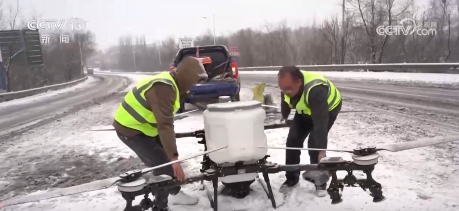 降雪致交通受阻 無人機大型機械撒鹽除雪