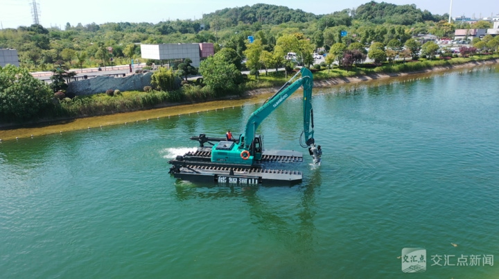 只見一臺身披“山河綠”的水陸兩棲挖掘機穩(wěn)穩(wěn)地在水中行駛。駕駛室里的工程師輕拉搖桿,這個足有兩層樓高的“鋼鐵巨獸”便靈活轉(zhuǎn)身,履帶劃過水面,泛起層層漣漪——輕巧的身姿完全顛覆了人們對挖掘機“只能在地上笨重行走”的固有印象。