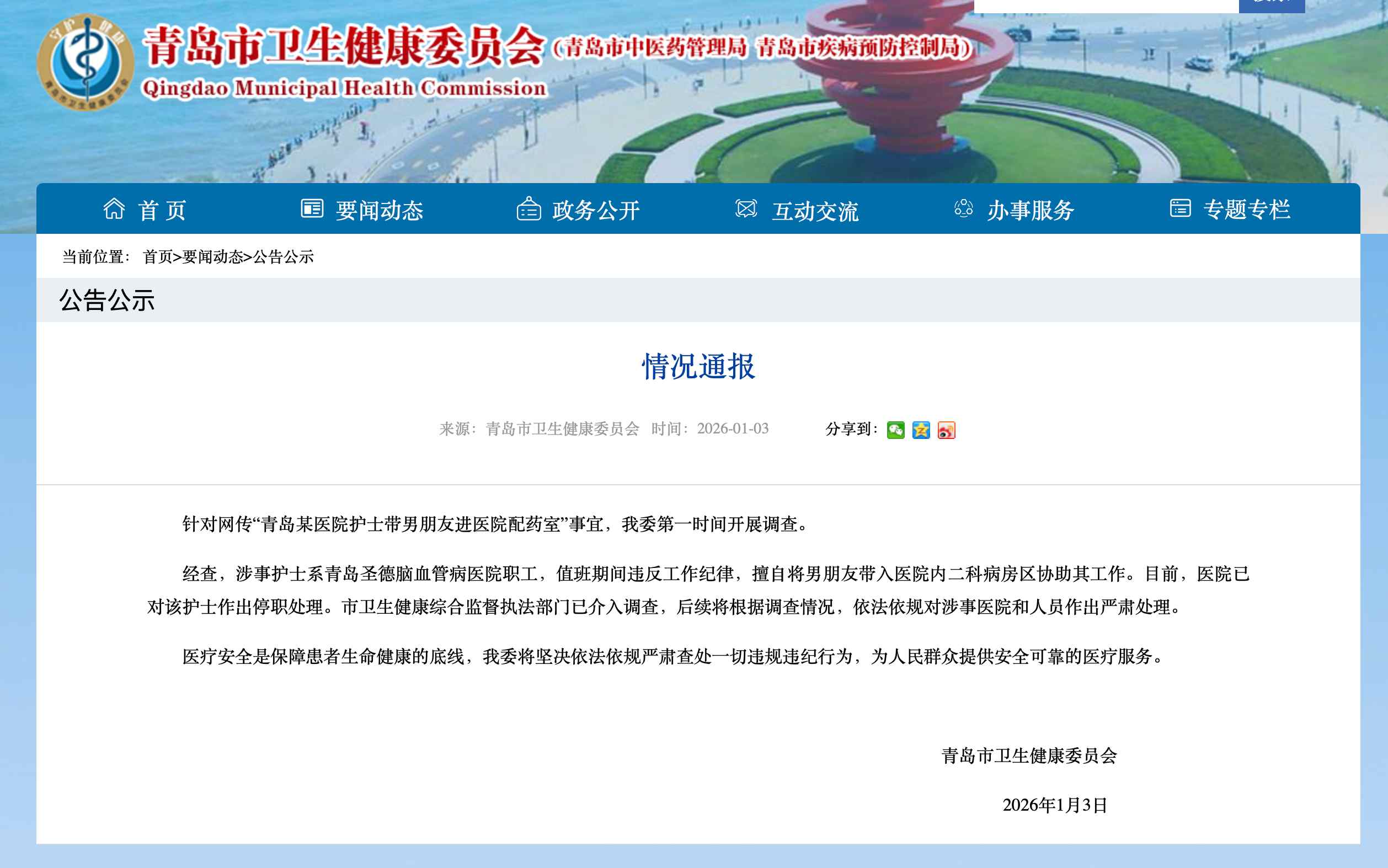 中國網(wǎng)1月3日訊 1月3日,青島市衛(wèi)生健康委員會發(fā)布情況通報:針對網(wǎng)傳“青島某醫(yī)院護(hù)士帶男朋友進(jìn)醫(yī)院配藥室”事宜,青島市衛(wèi)生健康委第一時間開展調(diào)查。