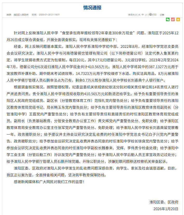 中新網(wǎng)1月21日電 據(jù)周口市淮陽區(qū)人民政府官網(wǎng)消息,近日,淮陽區(qū)委、區(qū)政府發(fā)布通告表示,針對網(wǎng)上反映淮陽人民中學(xué)“食堂承包商舉報(bào)校領(lǐng)導(dǎo)2年拿走300余萬現(xiàn)金”問題,淮陽區(qū)于2025年12月26日成立聯(lián)合調(diào)查組,開展全面調(diào)查核實(shí)?,F(xiàn)將有關(guān)情況通報(bào)如下: