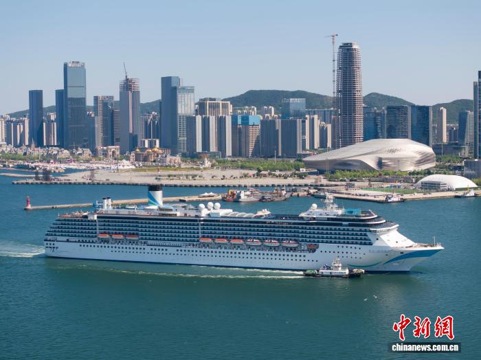 圖為郵輪駛過大連東港商務(wù)區(qū)。宮梁亮 攝