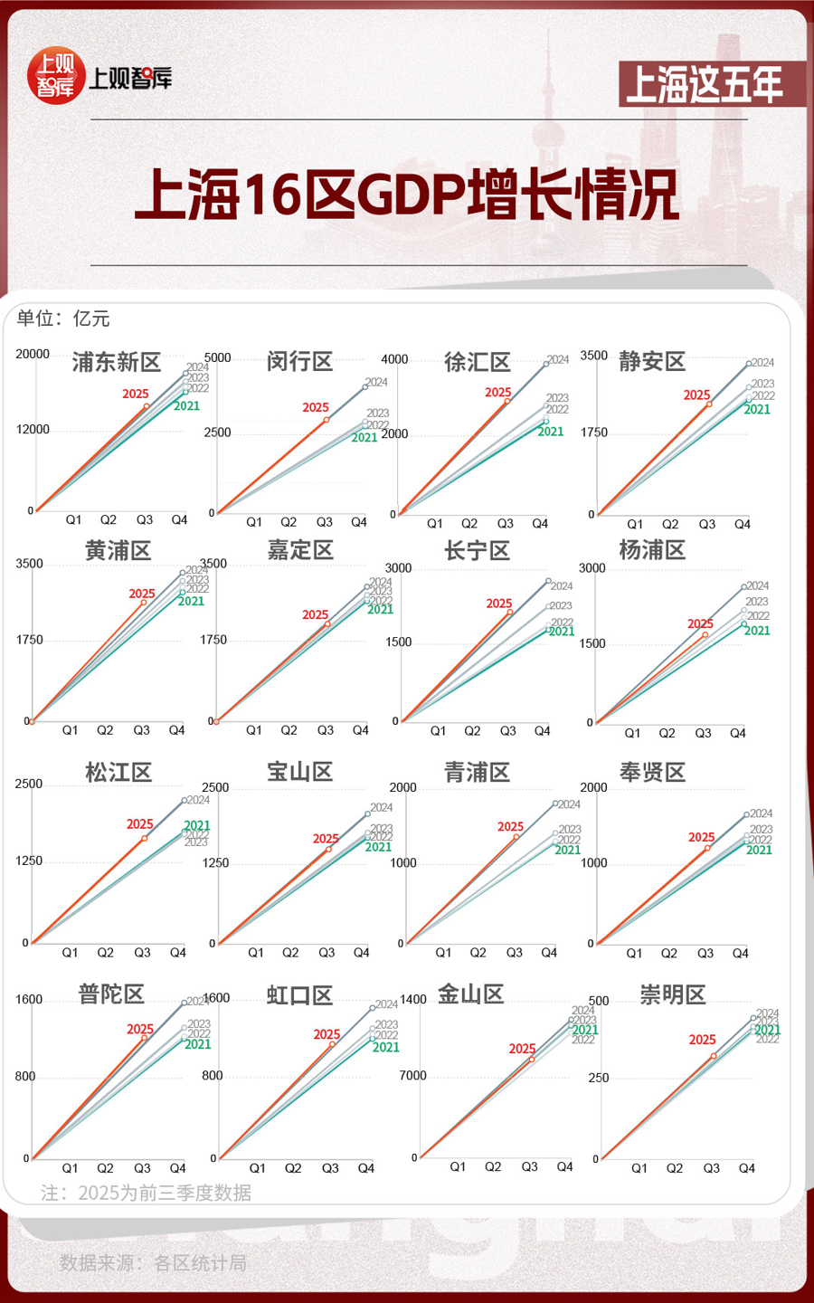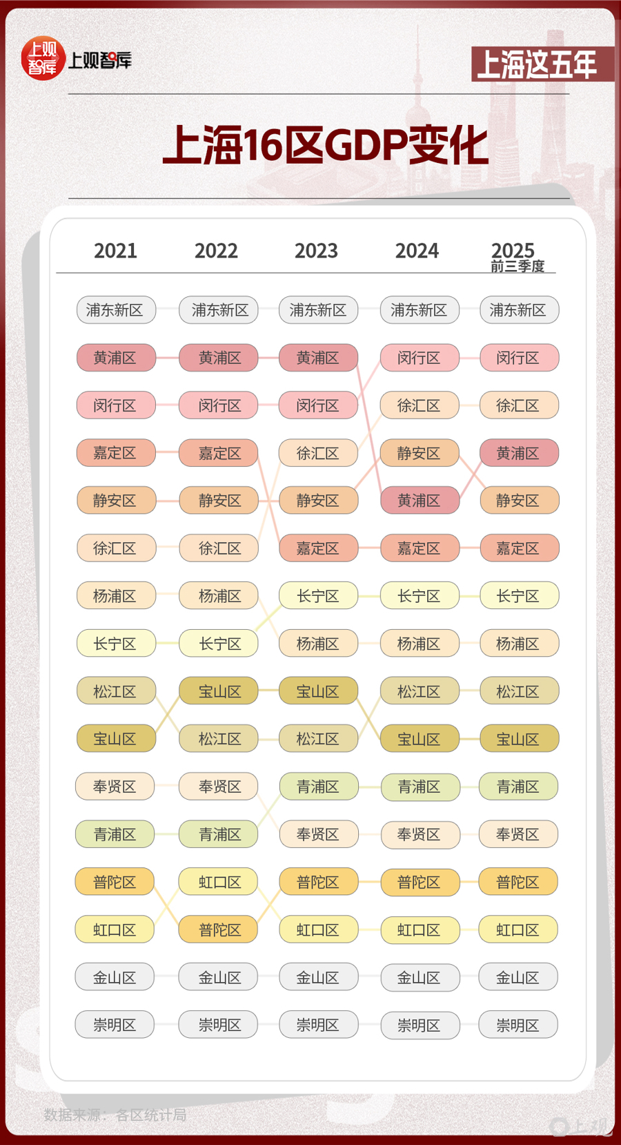 區(qū)域?qū)用?,上?6區(qū)GDP的變化,體現(xiàn)出從中心向多極擴(kuò)散的趨勢(shì)。2021年,浦東新區(qū)GDP占全市近36%,而到了2025年,這一比重下降至約33%。其他區(qū)在這五年間,充分發(fā)揮自身優(yōu)勢(shì),齊頭并進(jìn),為上海發(fā)展創(chuàng)造了更多增長(zhǎng)極。