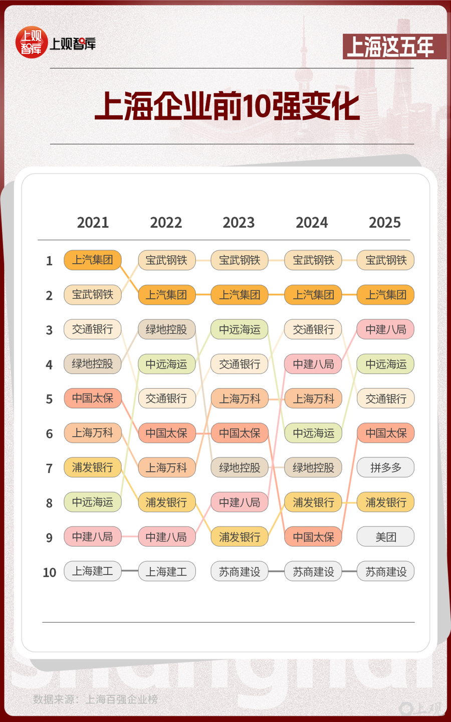 這份由上海市企業(yè)聯(lián)合會(huì)、上海市企業(yè)家協(xié)會(huì)、上海市經(jīng)濟(jì)團(tuán)體聯(lián)合會(huì)和解放日?qǐng)?bào)社共同發(fā)布的榜單,從2021年到2025年,見證了傳統(tǒng)企業(yè)的轉(zhuǎn)型與創(chuàng)新企業(yè)的涌現(xiàn)。在前10強(qiáng)的名單中,制造業(yè)仍然是上海產(chǎn)業(yè)的壓艙石,而房地產(chǎn)、建筑企業(yè)從2021年占比達(dá)40%,到2025年占比降低為20%?;ヂ?lián)網(wǎng)企業(yè)在2025年沖上前10強(qiáng),并占據(jù)了20%的席位,亮出了上海經(jīng)濟(jì)多元發(fā)展的成績(jī)單。