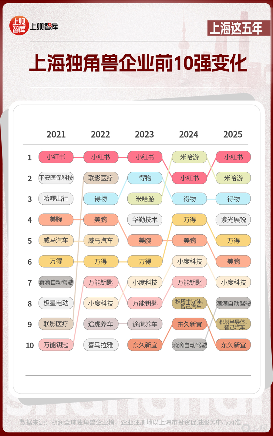 前10位的上海獨(dú)角獸企業(yè),從2021年到2025年,發(fā)生了不小的改變。有的企業(yè)已經(jīng)上市,如聯(lián)影醫(yī)療、華勤技術(shù)等;有的企業(yè)悄然退場(chǎng);有的企業(yè)仍持續(xù)霸榜,如小紅書、米哈游、得物、美腕、萬(wàn)得。獨(dú)角獸企業(yè)的變動(dòng)與產(chǎn)業(yè)趨勢(shì)息息相關(guān)。當(dāng)新能源汽車產(chǎn)業(yè)進(jìn)入高質(zhì)量發(fā)展的階段時(shí),智己汽車接過(guò)領(lǐng)軍大旗;在AI芯片成為市場(chǎng)熱點(diǎn)時(shí),積塔半導(dǎo)體、紫光展銳已躋身芯片新勢(shì)力代表之列。