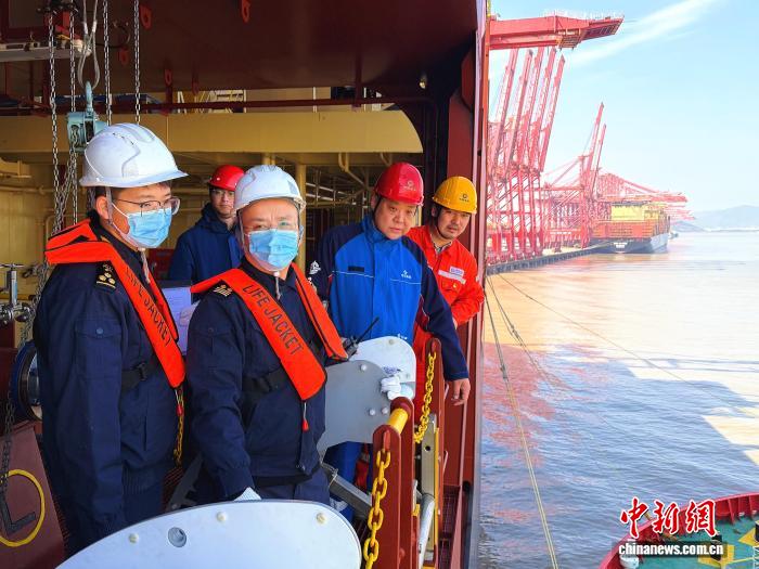 2月13日,寧波海關(guān)所屬北侖海關(guān)關(guān)員正在現(xiàn)場(chǎng)監(jiān)管保稅LNG加注情況。吳夢(mèng)凱 攝