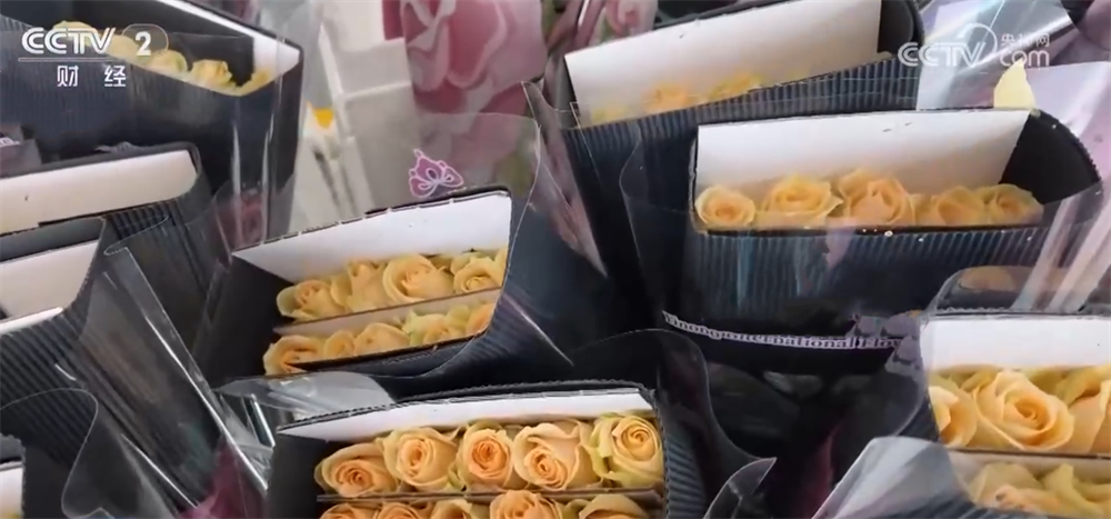 商家介紹,本月出口鮮花的發(fā)貨量是日常的五倍,目前訂單已經(jīng)排到年后。新鮮采摘的鮮花在出口商車間完成分揀、包裝、保鮮等處理后,由冷鏈送往機(jī)場過關(guān)出口,整個(gè)流程最快不到20小時(shí)就能完成。