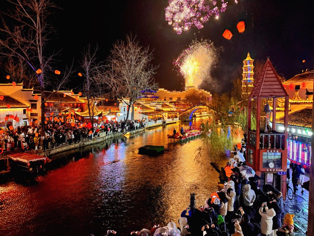 游客在犁橋水鎮(zhèn)觀看煙花表演。(受訪者供圖)