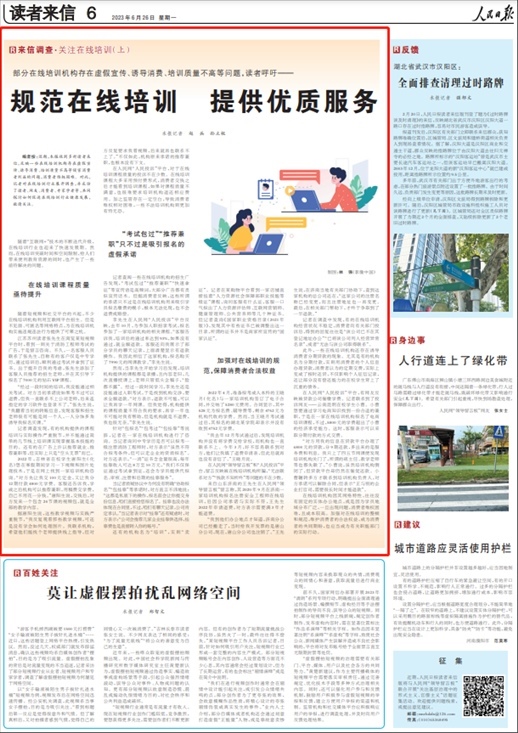 根據(jù)網(wǎng)友反饋的問題,6月26日,人民日報(bào)讀者來信版“來信調(diào)查”欄目刊發(fā)在線培訓(xùn)調(diào)查報(bào)道《規(guī)范在線培訓(xùn) 提供優(yōu)質(zhì)服務(wù)》,文中多處引用了人民網(wǎng)“人民投訴”平臺用戶相關(guān)案例和線索。