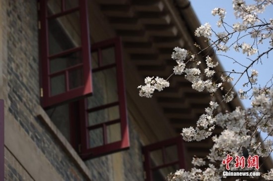 白色櫻花與青色琉璃瓦相映成畫(huà)。