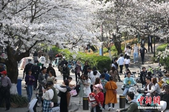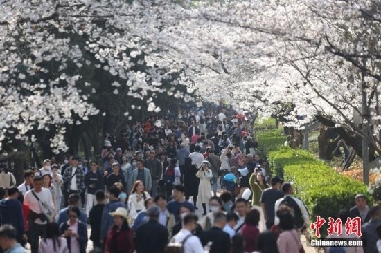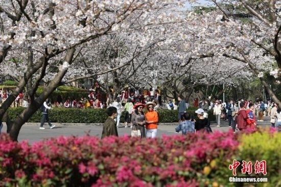 武漢大學(xué)櫻花樹(shù)下人潮涌動(dòng)。