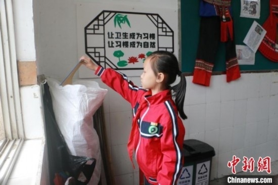 圖為學(xué)生將可回收物放置進(jìn)班級(jí)里的回收袋中。林馨 攝
