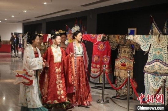 9月28日晚,第十四屆中華世紀壇中秋詩會在京舉行,圖為民眾身著漢服參觀京劇服裝。 主辦方供圖