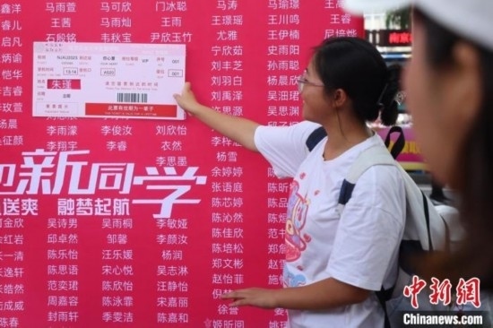 新生手持夢想“機(jī)票”打卡新生名單墻。泱波 攝