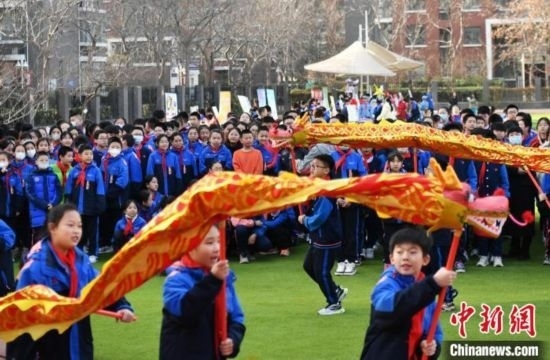 3月11日,學(xué)生們舞龍,感受傳統(tǒng)文化魅力。中新網(wǎng)記者 翟羽佳 攝