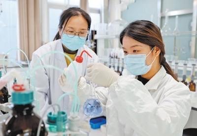山東省棗莊市西王莊鎮(zhèn)一個(gè)實(shí)驗(yàn)室內(nèi),碩士研究生晁齊齊(右)在做化學(xué)實(shí)驗(yàn)。孫中喆攝(人民視覺)