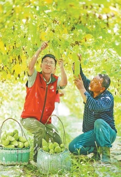 廣西壯族自治區(qū)靈川縣靈田鎮(zhèn)東田村,來(lái)自山東大學(xué)的博士研究生羅雯耀(左)在幫村民采摘。黃勇丹攝(人民視覺)