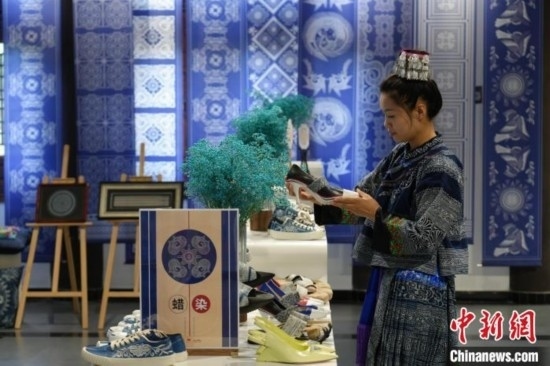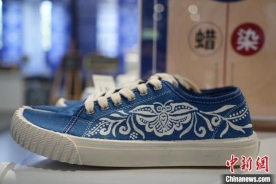 6月19日,織金縣平遠(yuǎn)古鎮(zhèn)依文織金數(shù)字化展廳展示的蠟染帆布鞋。周燕玲 攝