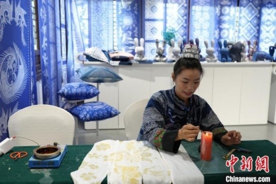 貴州織金苗族蠟染2021年6月入選國(guó)務(wù)院公布第五批國(guó)家級(jí)非物質(zhì)文化遺產(chǎn)代表性項(xiàng)目名錄。“95后”苗族女孩王秋雨大學(xué)畢業(yè)后回到織金,成為一名織金苗族蠟染推廣者。她不僅使用傳統(tǒng)小臘刀,還使用大臘刀和毛筆,以蜂蠟為墨在絲巾、衣服、箱包上繪制小篆、甲骨文、山水等文字與圖案,這些蠟染產(chǎn)品深受消費(fèi)者喜愛(ài)。圖為6月19日,王秋雨在織金縣平遠(yuǎn)古鎮(zhèn)的依文織金數(shù)字化展廳制作蠟染。周燕玲 攝