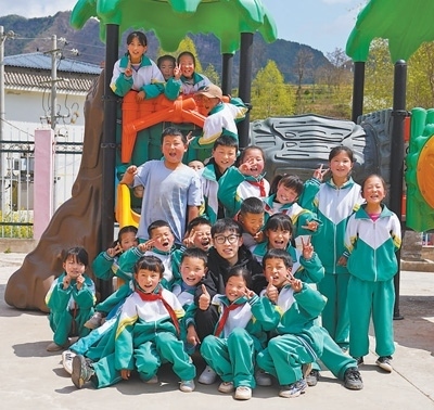 張鵬程和孩子們在課間活動(dòng)時(shí)合影。受訪者供圖