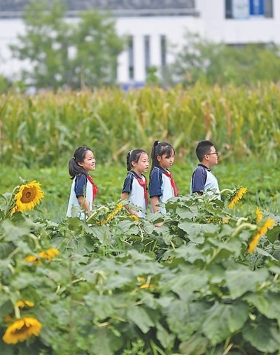 9月1日,天津師范大學(xué)第三附屬小學(xué)組織學(xué)生在校勞動種植基地,開展認(rèn)識農(nóng)作物的開學(xué)第一課。新華社記者 李 然攝