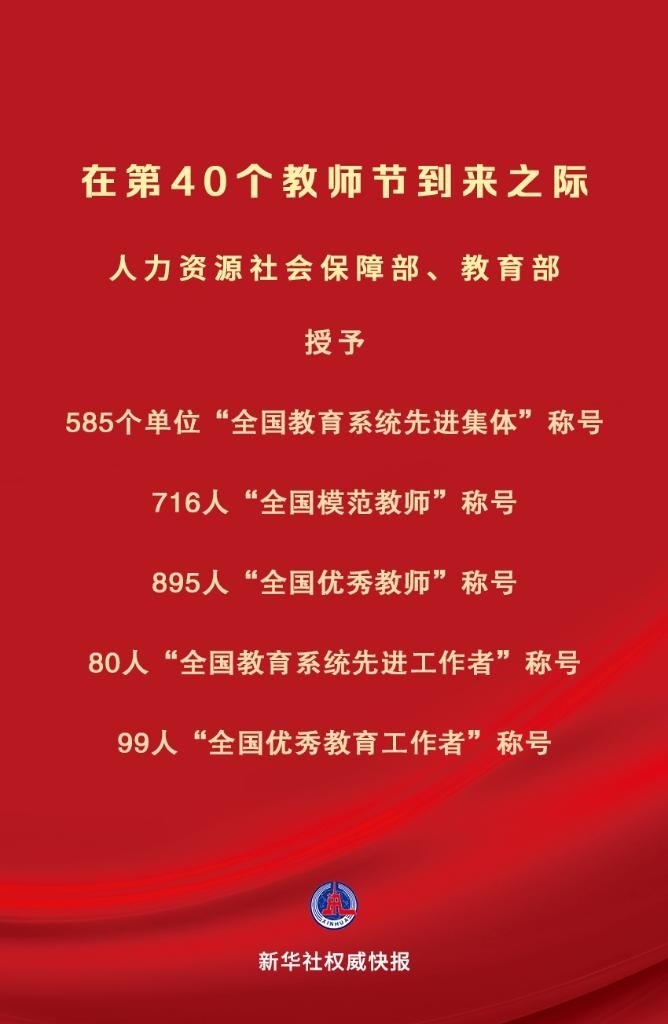 在中華人民共和國(guó)成立75周年和第40個(gè)教師節(jié)到來(lái)之際,為大力弘揚(yáng)教育家精神,營(yíng)造全社會(huì)尊師重教濃厚氛圍,激勵(lì)全國(guó)廣大教師和教育工作者落實(shí)立德樹(shù)人根本任務(wù),積極投身教育強(qiáng)國(guó)建設(shè),人力資源社會(huì)保障部、教育部決定授予中央財(cái)經(jīng)大學(xué)金融學(xué)院等585個(gè)單位“全國(guó)教育系統(tǒng)先進(jìn)集體”稱(chēng)號(hào);授予刁榮春等716名同志“全國(guó)模范教師”稱(chēng)號(hào);授予于淵等895名同志“全國(guó)優(yōu)秀教師”稱(chēng)號(hào);授予王彥平等80名同志“全國(guó)教育系統(tǒng)先進(jìn)工作者”稱(chēng)號(hào);授予王軍等99名同志“全國(guó)優(yōu)秀教育工作者”稱(chēng)號(hào)。