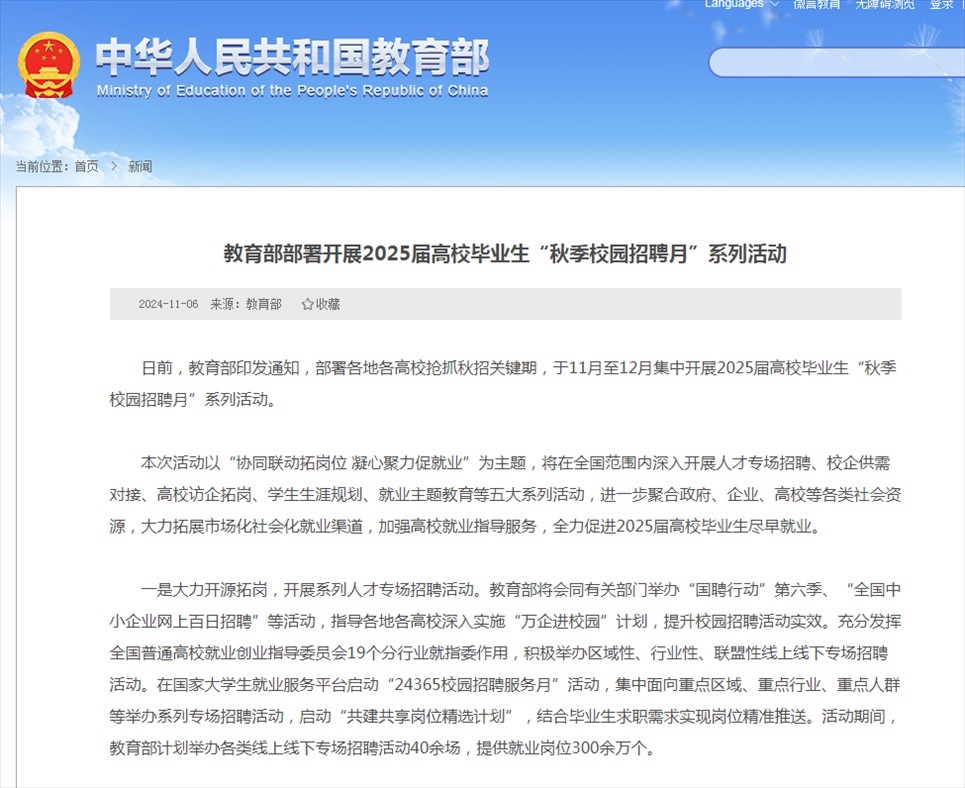 記者11月6日從教育部獲悉,教育部近日印發(fā)通知,部署各地各高校搶抓秋招關(guān)鍵期,于11月至12月集中開展2025屆高校畢業(yè)生“秋季校園招聘月”系列活動(dòng)。