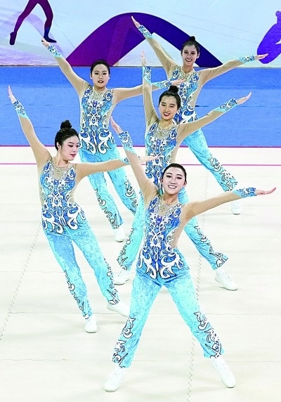 12月5日,第18屆中國大學(xué)生健美操錦標賽在河北省遷安市舉行。圖為江西師范大學(xué)代表隊在甲組中國大學(xué)生中級校園健美操規(guī)定動作決賽中。新華社記者 楊世堯攝