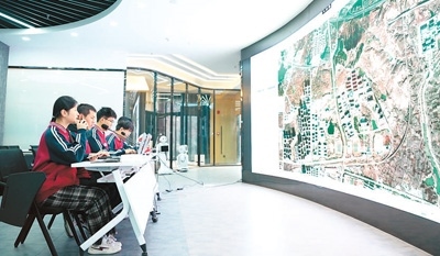 學生在學校低空空域管控服務中心進行無人機飛行作業(yè)的航線規(guī)劃、飛行任務管理。