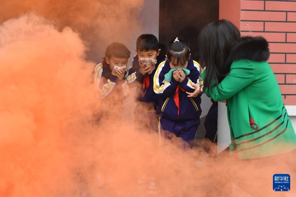 3月31日,在山東省青島市市北區(qū)杭州路小學(xué)開展的校園消防安全主題教育活動上,師生模擬校園安全門逃生演練。