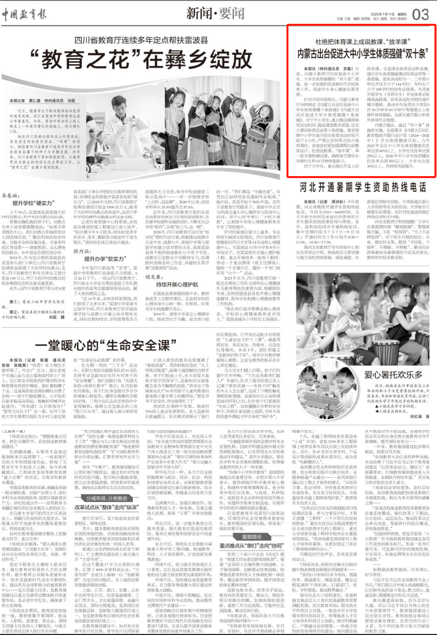 2025年7月11日,《中國(guó)教育報(bào)》第3版刊發(fā)題為《杜絕把體育課上成說(shuō)教課、“放羊課”內(nèi)蒙古出臺(tái)促進(jìn)大中小學(xué)生體質(zhì)強(qiáng)健“雙十條”》的文章,報(bào)道了內(nèi)蒙古教育廳印發(fā)促進(jìn)中小學(xué)生、大學(xué)生體質(zhì)強(qiáng)健的“雙十條”措施,進(jìn)一步加強(qiáng)和改進(jìn)新時(shí)代學(xué)校體育工作,促進(jìn)學(xué)生身心健康全面發(fā)展。