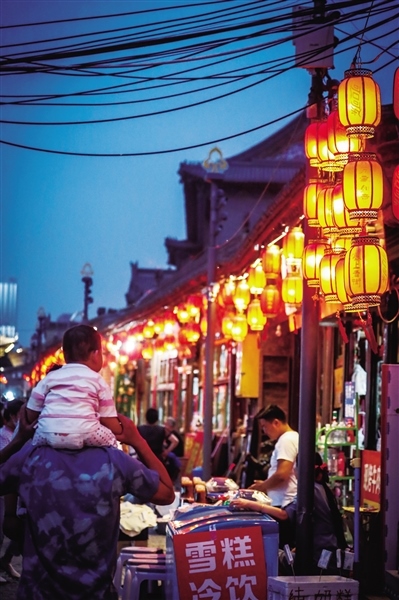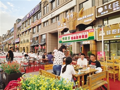 與大召濃厚的本土文化特色相比,惱包村是另外一種具有江南風(fēng)格的消遣之地,人們流連于它的小橋流水,在這里不僅大人們可以消遣,孩子們也有游玩的地方。旋轉(zhuǎn)木馬、跳跳床等,給孩子們?cè)鎏砹烁嗟臍g樂。而在萬達(dá)花樣年華步行街,因?yàn)殚_放夜市,沿街商戶的營業(yè)時(shí)間延長(zhǎng)到了晚上22時(shí),這對(duì)于經(jīng)營水果、蔬菜生意的店老板閆先生來說無疑是好消息?!耙故胁砰_了幾天,我們家的營業(yè)額就大幅度提升了,比之前要多出來1000塊錢,因?yàn)橹苓吘褪蔷用裥^(qū),大家出來閑逛,看到蔬菜、水果自然而然的就會(huì)挑選,我們的生意也就好做了?!遍Z先生說。