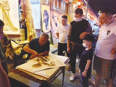 在老街上一些具有民族特色的皮畫店、皮包店也成為了人們駐足消費(fèi)、觀賞的熱點(diǎn)商鋪。在一家皮畫店,皮畫師在現(xiàn)場(chǎng)制作皮畫,看著精美的圖案被皮畫師一筆一筆地勾勒出來,不少市民都忍不住停下腳步。“帶孩子出來閑逛,看到皮畫孩子主動(dòng)提出來要看,皮畫是咱們呼市特有的,現(xiàn)場(chǎng)制作,能讓更多人了解制作過程,了解皮畫,挺好的?!笔忻裰芟壬f。