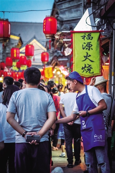 6月7日正值周日,夜幕還未降臨,大召廣場(chǎng)上已經(jīng)聚集了不少消遣的市民,他們當(dāng)中有六七十歲的老人,也有二三十歲的青年,還有牽著父母手的孩童。隨著時(shí)間的推移,廣場(chǎng)上的人越來越多,而緊挨著廣場(chǎng)的通順大巷更是人頭攢動(dòng),吆喝聲、叫賣聲、談笑聲、音樂聲混在一起,形成了夏季獨(dú)有的市井之聲。街上,從本地的稀果羹、羊肉串、烤面筋到北京爆肚、武漢臭豆腐可謂應(yīng)有盡有,家家戶戶的門前都或多或少的有市民排隊(duì)等候。