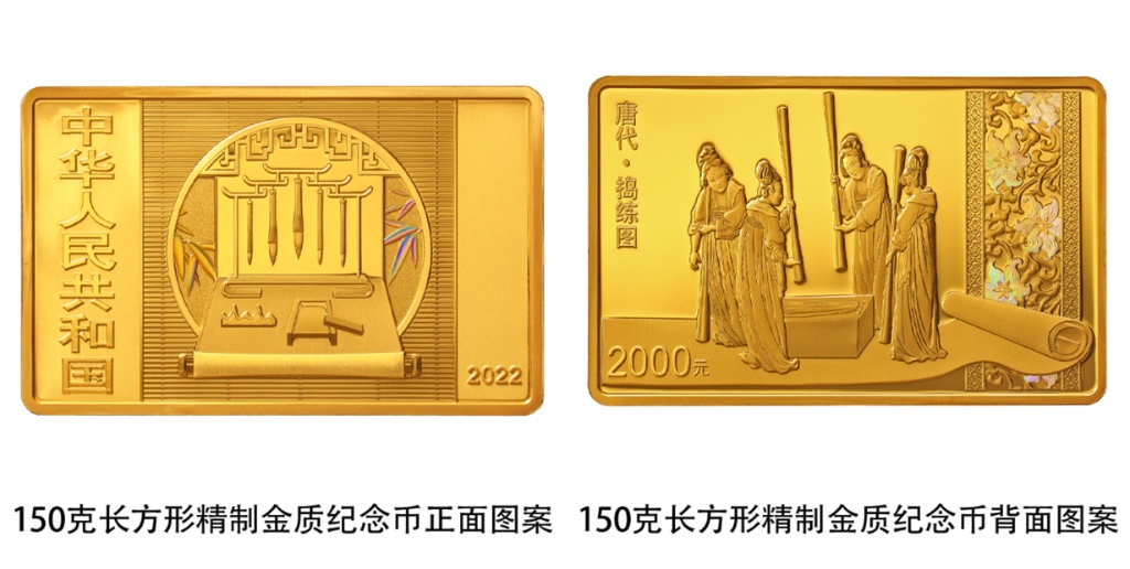 該套金銀紀(jì)念幣正面圖案均為筆、墨、紙、硯造型,輔以竹葉、窗等裝飾組合設(shè)計,背面圖案則各有特色。一枚150克長方形金質(zhì)紀(jì)念幣背面圖案為《搗練圖》中搗練場景,襯以裝飾紋樣組合設(shè)計,并刊“唐代·搗練圖”字樣及面額。