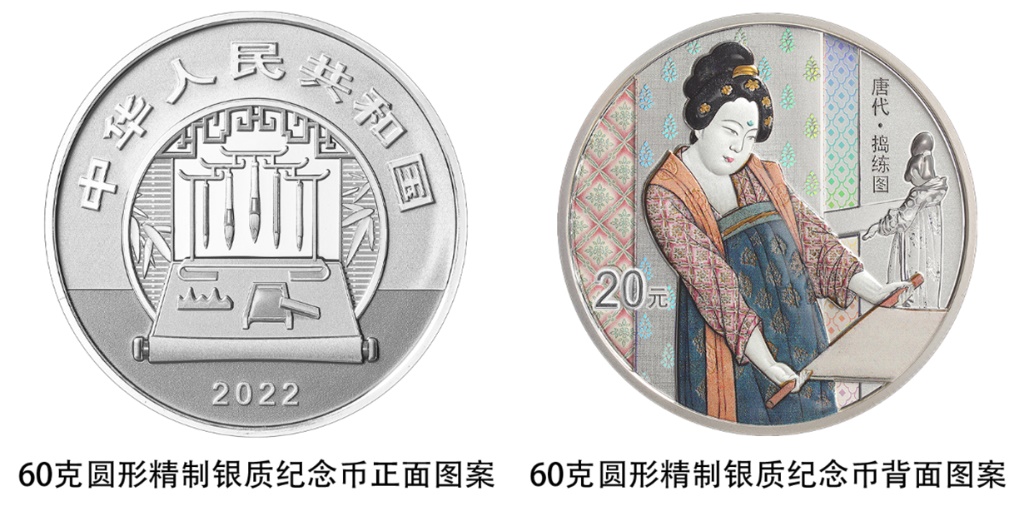 一枚60克圓形銀質(zhì)紀(jì)念幣背面圖案為《搗練圖》中熨燙、嬉戲造型,襯以裝飾紋樣組合設(shè)計,并刊“唐代·搗練圖”字樣及面額。